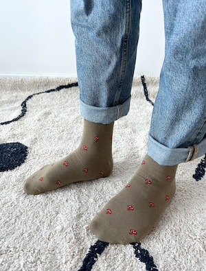小さな赤いきのこ柄が遊び心をプラスする “ mushroom pattern socks ”