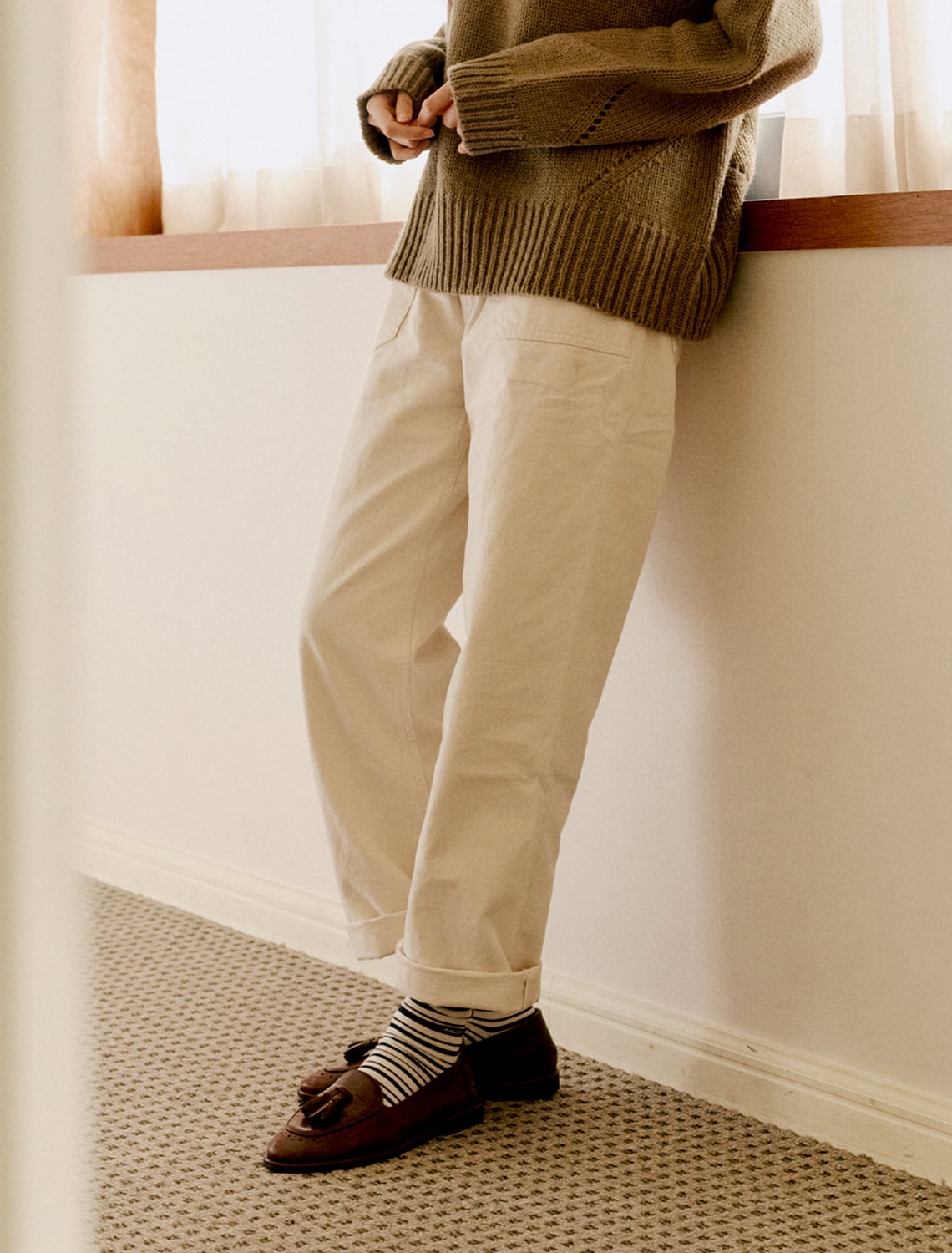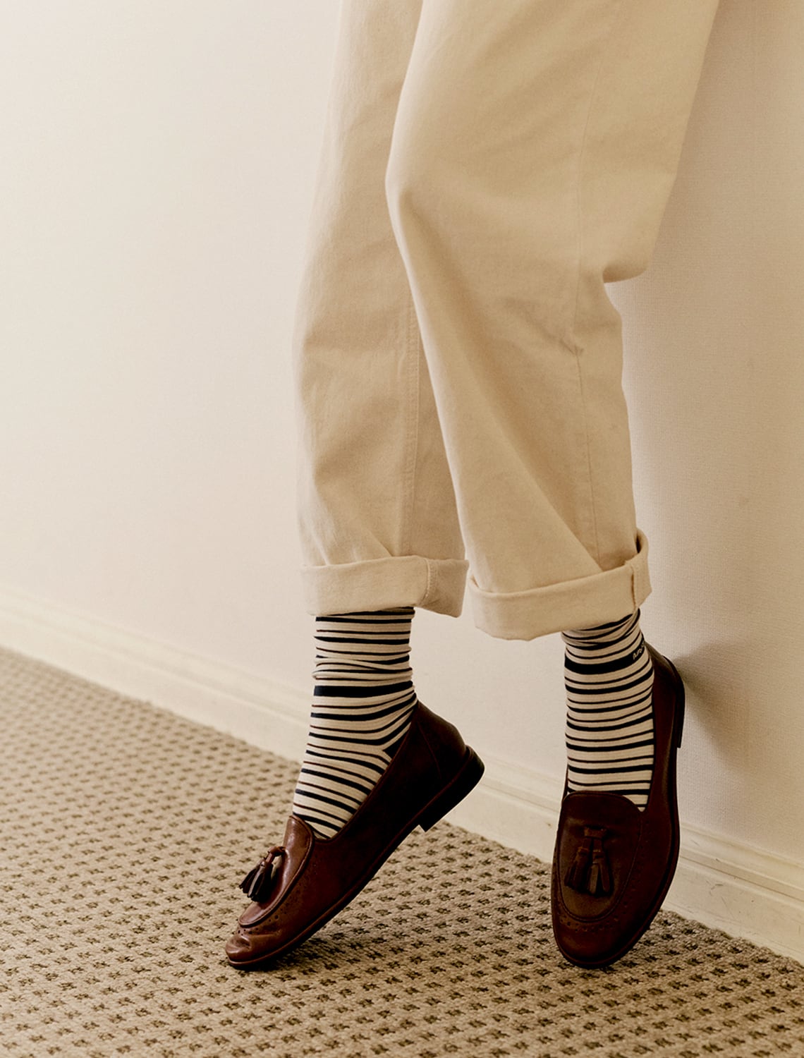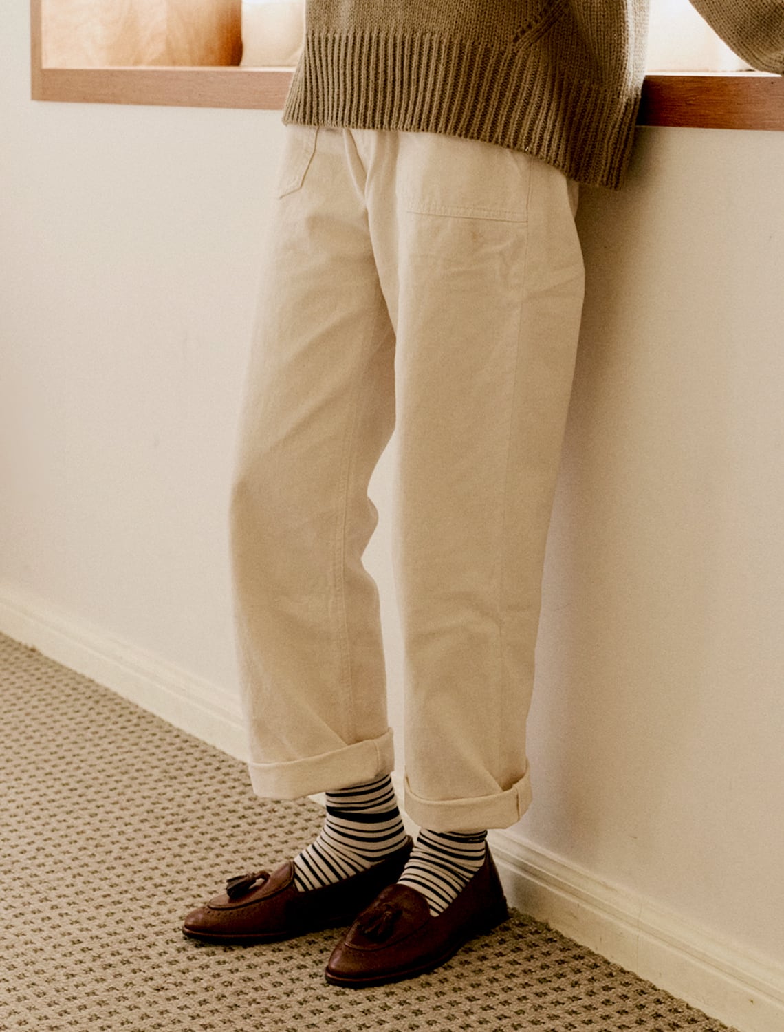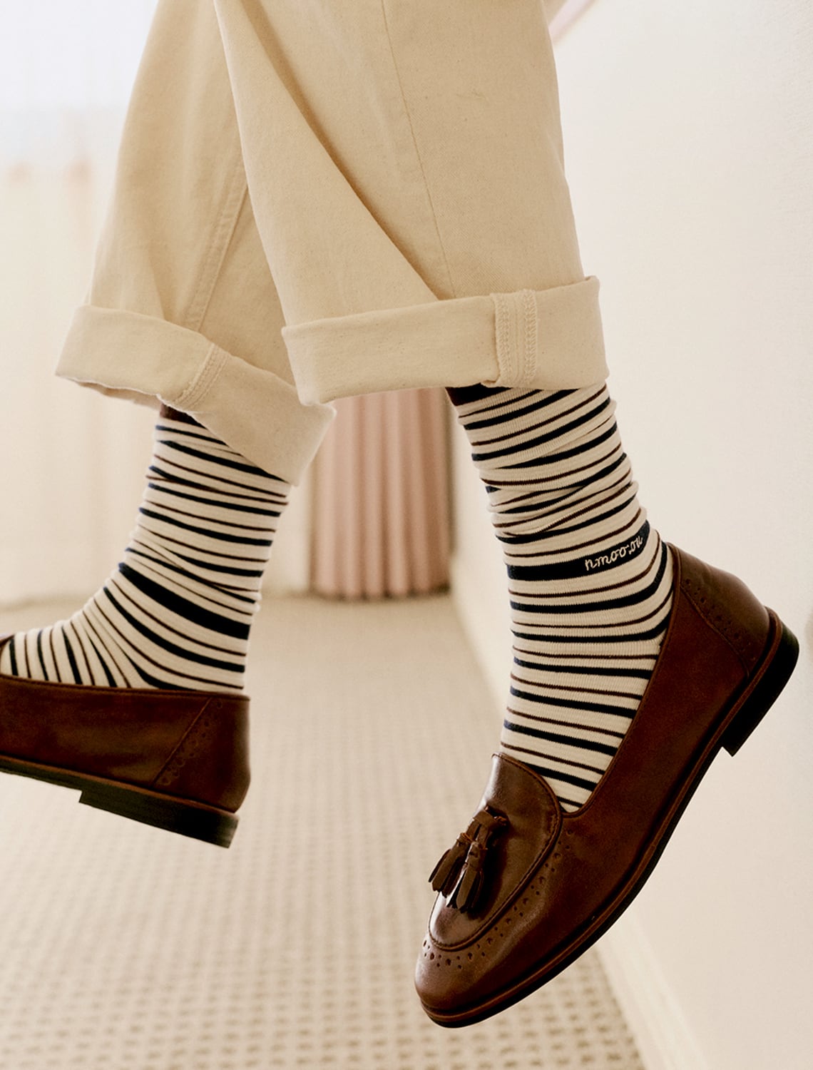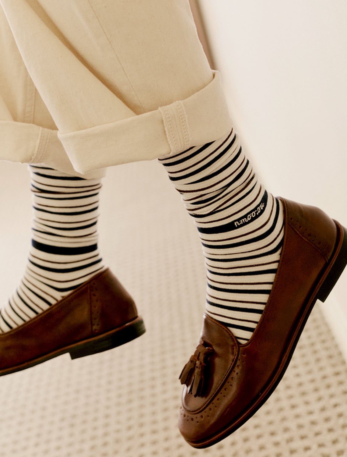 パンツとシューズの間から自然に見える位置にさりげない刺繍がポイント。