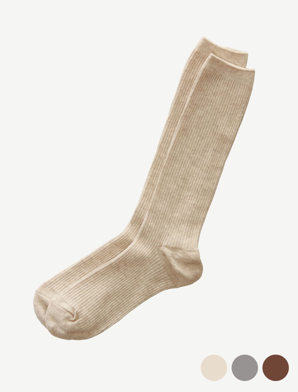 ベーシックなハイソックスは伸ばして履くとトレンド感のあるスタイルに。アイボリー、ライトグレー、ブラウンの使いやすい3色展開で色違いで持っておきたいアイテムです。